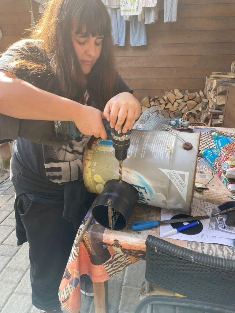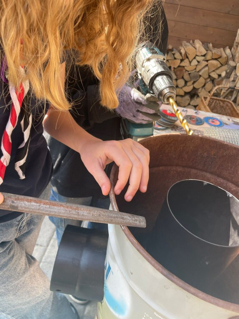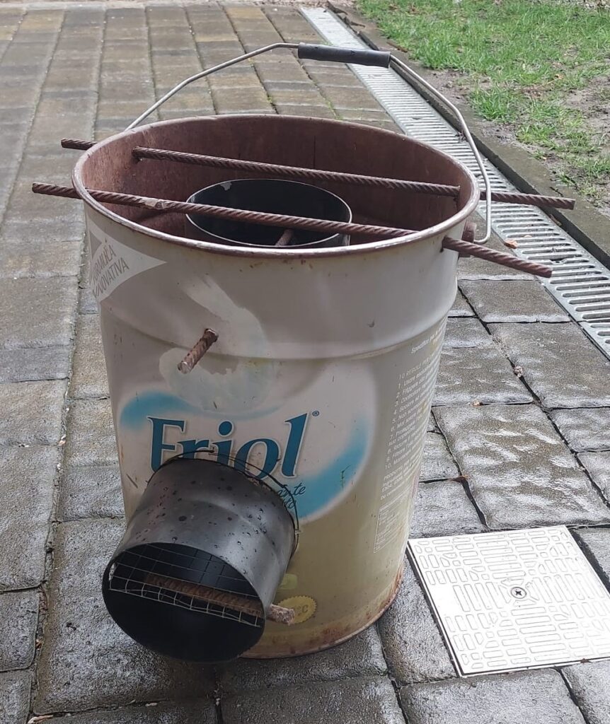 spezzoni di tubo per stufa(circa 12 cm di diametro minimo)contenitore per il combustibile (legna)pezzi di recupero dalla sede